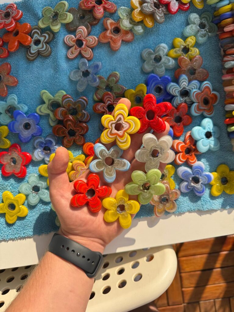 Discover our 2 cm handmade matte thick-style glass flower beads, crafted individually in a 1200°C flame using traditional Turkish glass-making techniques.